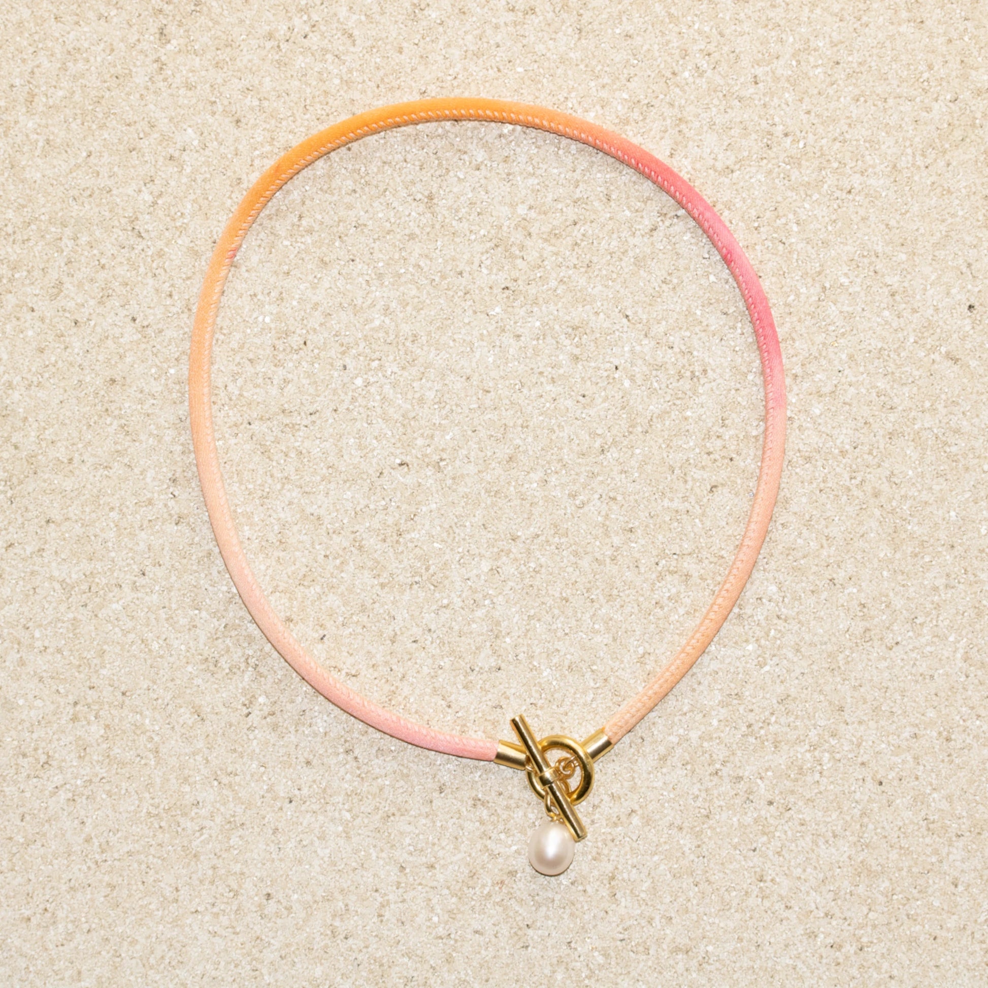 The Daydream Pearl Collar Necklace is a pink and orange tie-dyed silk design, created in collaboration with print designer Fran Buss. Featuring a chunky 18kt gold vermeil toggle clasp with a freshwater cultured pearl pendant to add subtle detail.