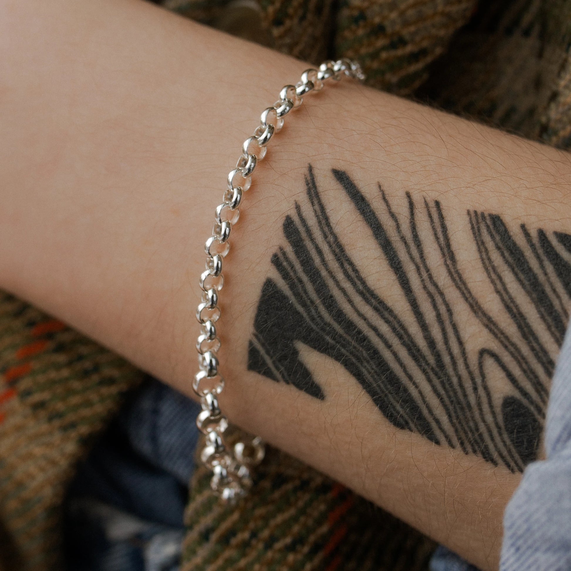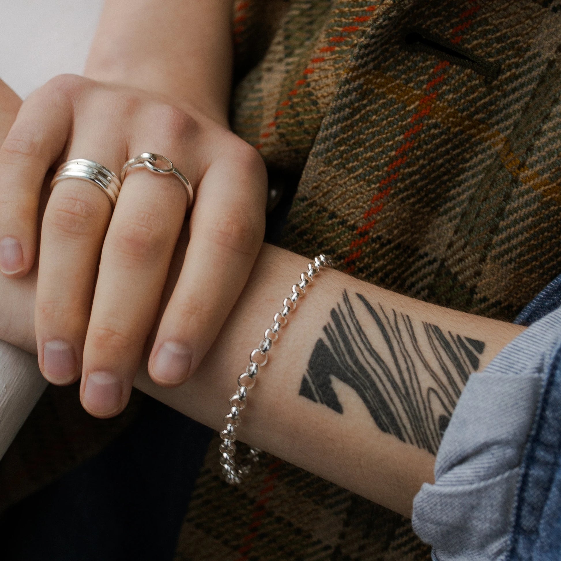 We recommend pairing the Graduated Bracelet in sterling silver with the Loop Ring and Trio Ring, as worn by Molly.