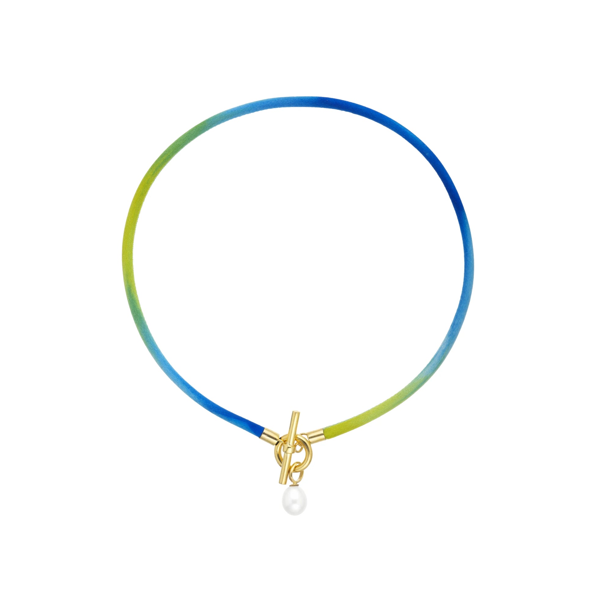 The Hazy Pearl Collar Necklace is a green and blue tie-dyed silk design, created in collaboration with print designer Fran Buss. Featuring a chunky 18kt gold vermeil toggle clasp with a freshwater cultured pearl pendant to add subtle detail.