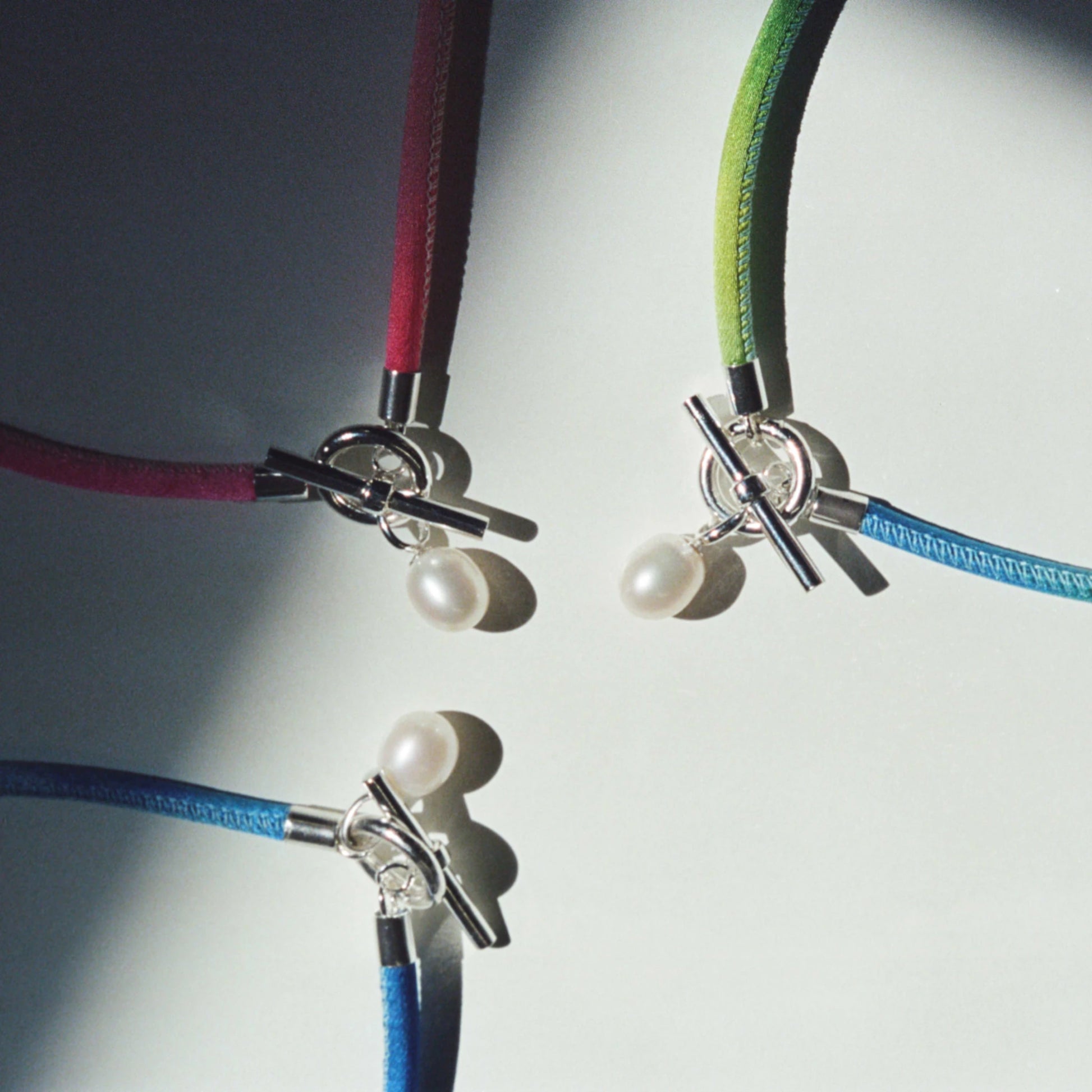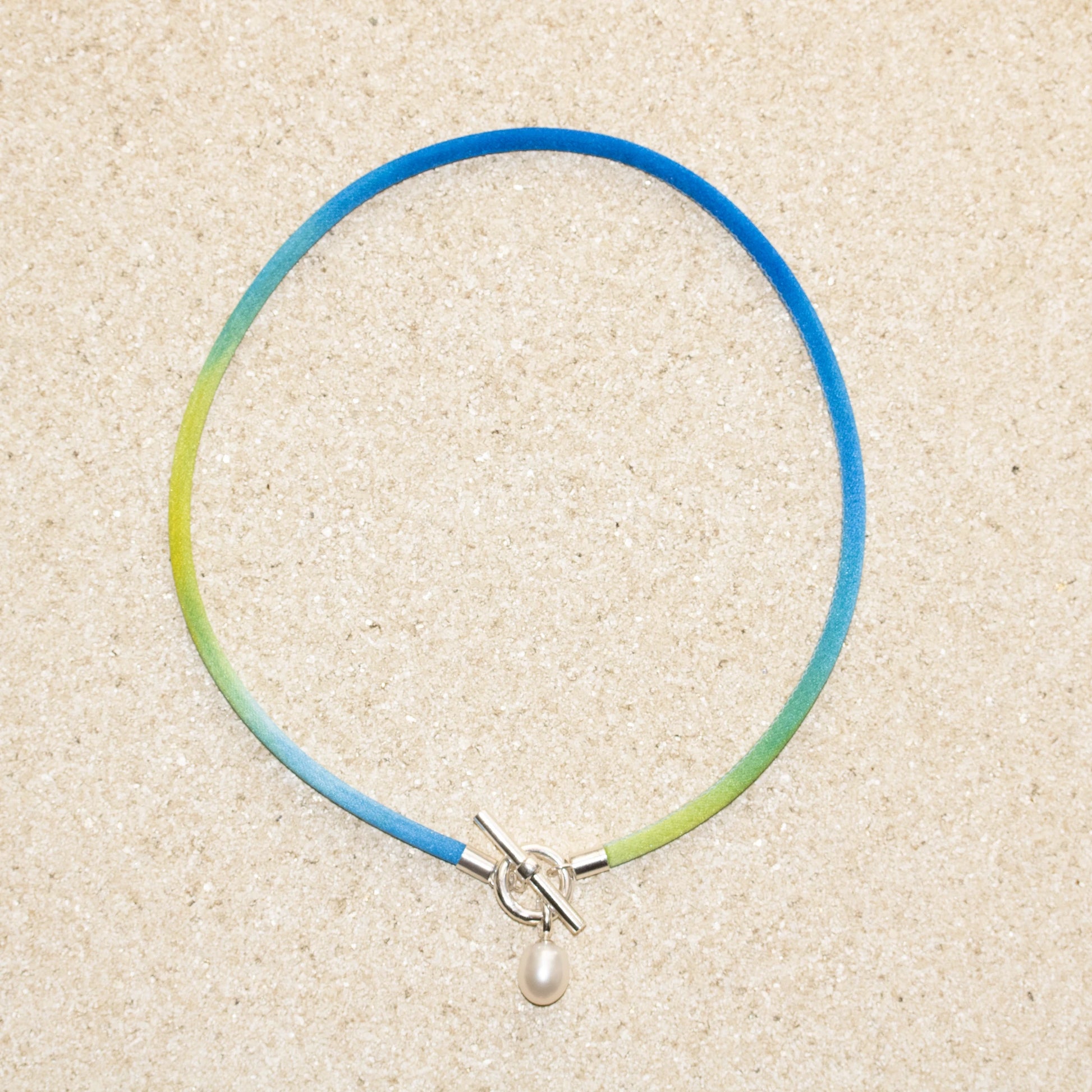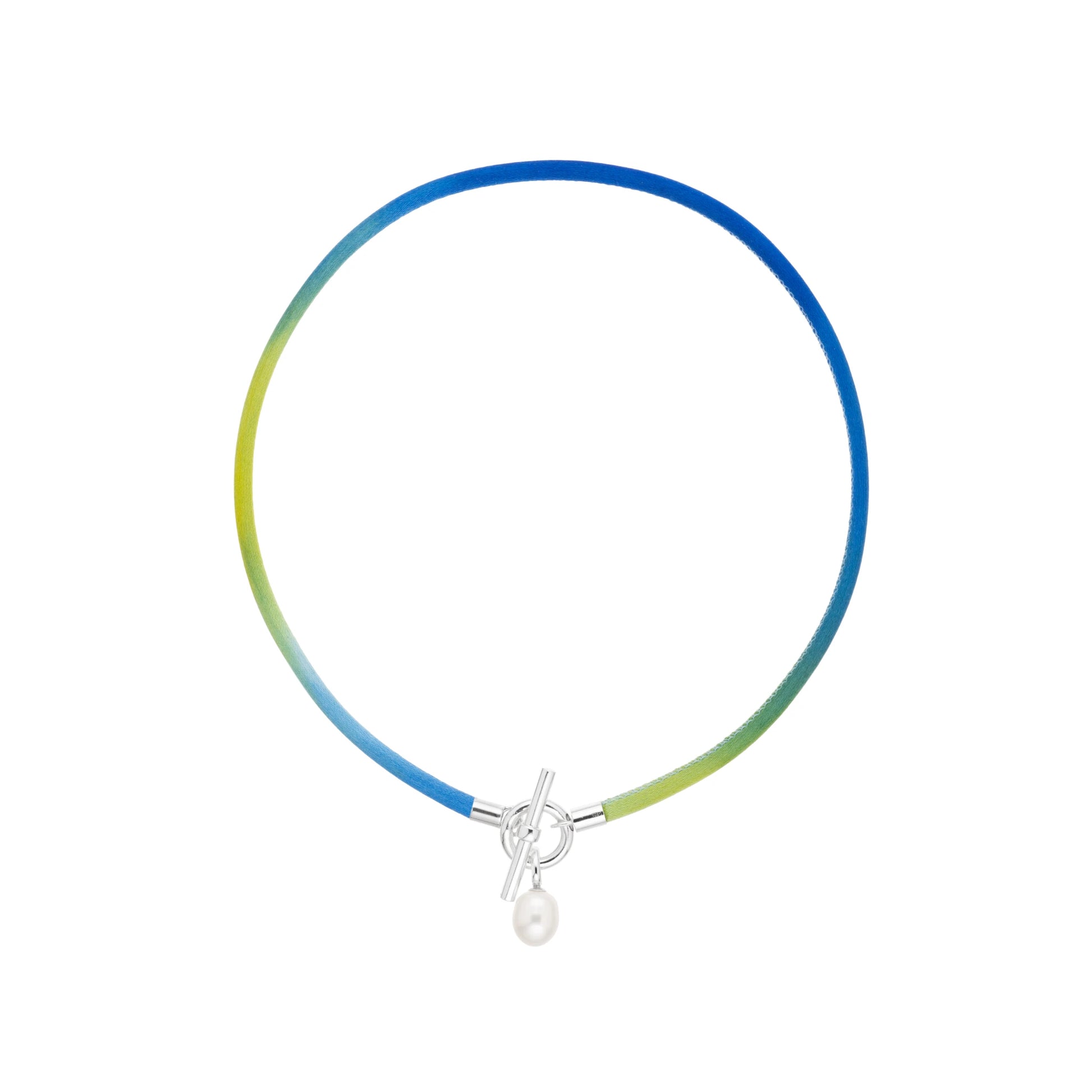 Created in collaboration with print designer Fran Buss, the Hazy Pearl Collar Necklace is a tie-dyed green and blue silk rope design. The necklace features a chunky sterling silver toggle clasp with a freshwater cultured pearl pendant.