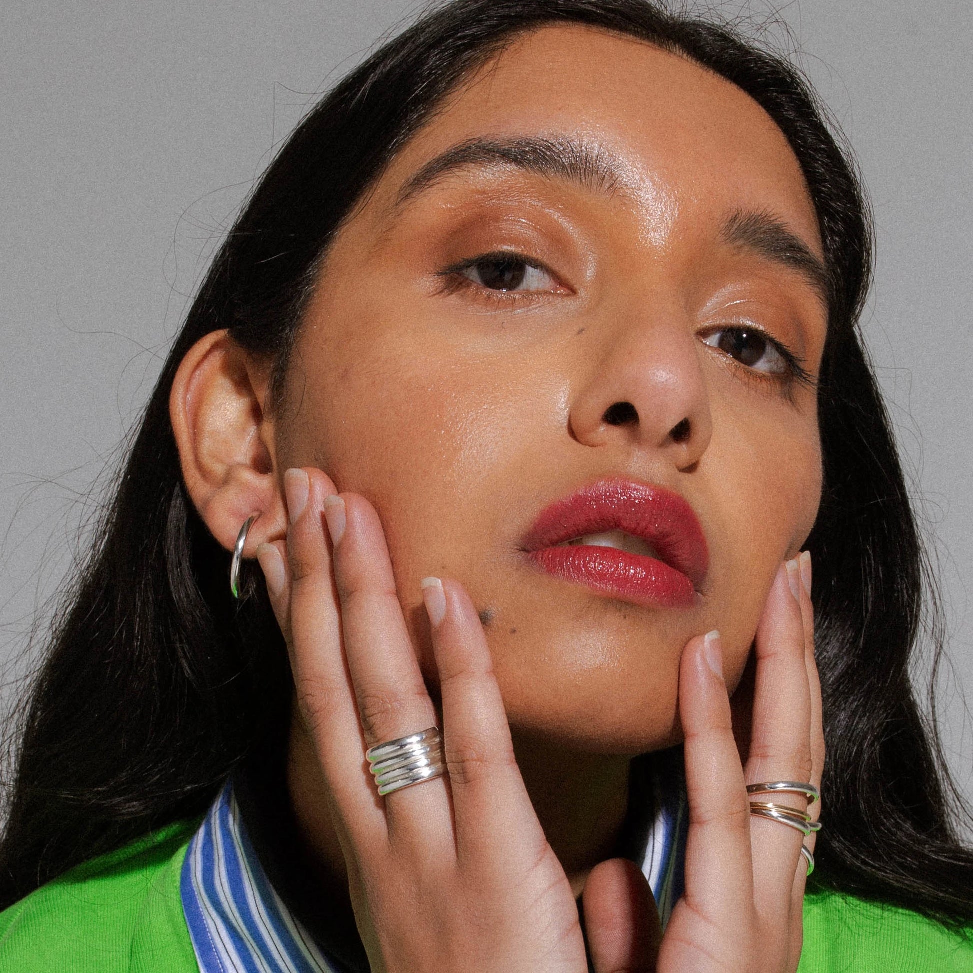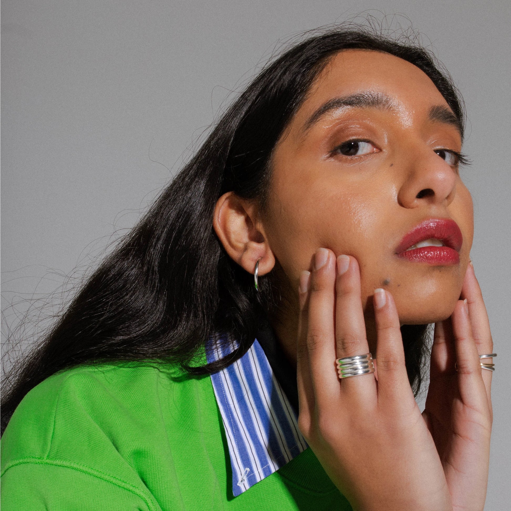 Paired with chunkier jewellery styles, Nehal is also wearing the Dune Ring and Swivel Ring.