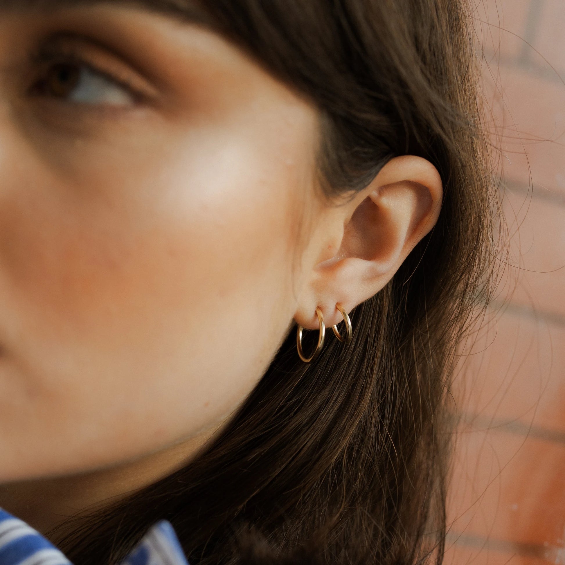 We recommend layering the mini faceted hoop earrings with the faceted hoops in 9kt gold, as worn by Molly.