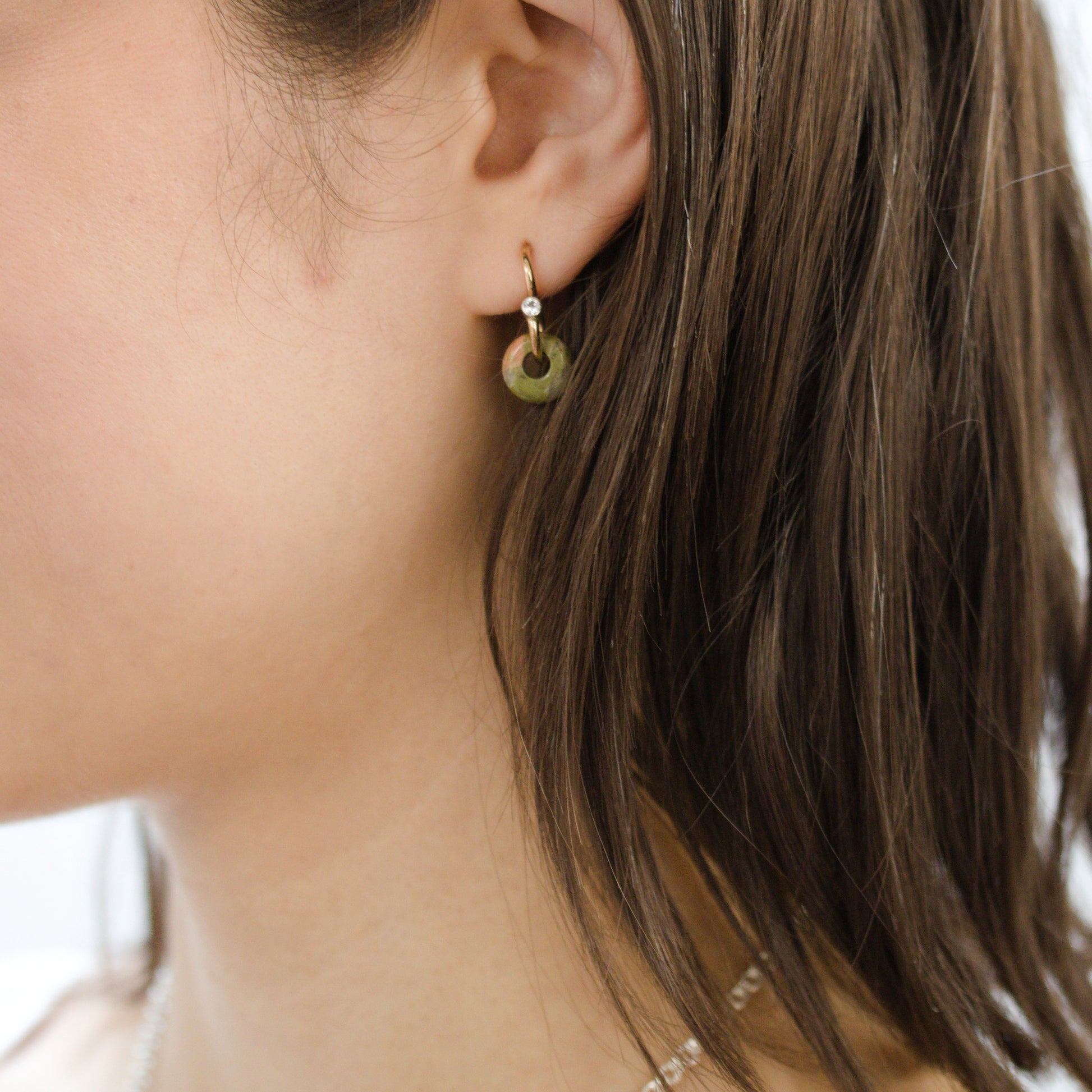 An S shaped simple hook design incorporating unakite and white topaz gemstones. Mix and match the mini poise earrings with hoop earrings for a fun look.