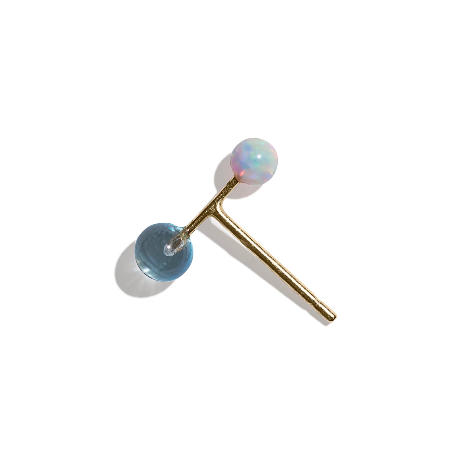 This single barbell earring features an iridescent synthetic white opal and sky blue topaz connected by a 9kt gold bar. Sold as a single stud so you can mix and match with other barbell studs for a playful look.