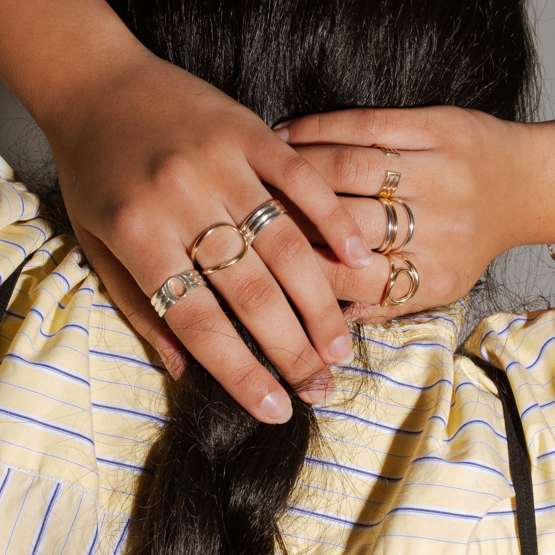 We recommend pairing the Outline Signet Ring with the Trio Ring for chunky layering.