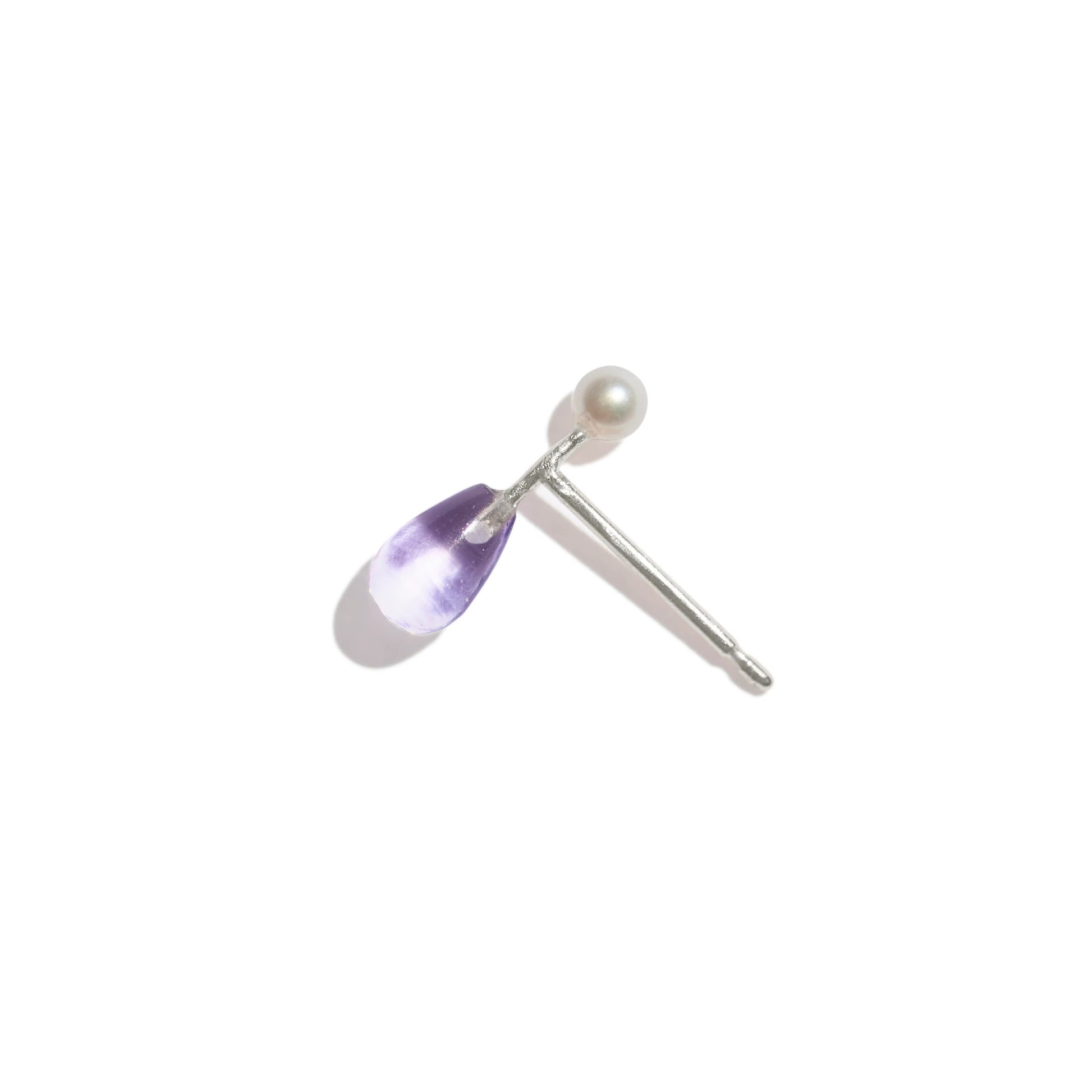 This single barbell earring features a dainty pearl and a shimmering teardrop amethyst connected by a sterling silver bar. Sold as a single earring so you can mix and match with other barbell studs, or wear on its own in a second lobe piercing alongside other earrings.