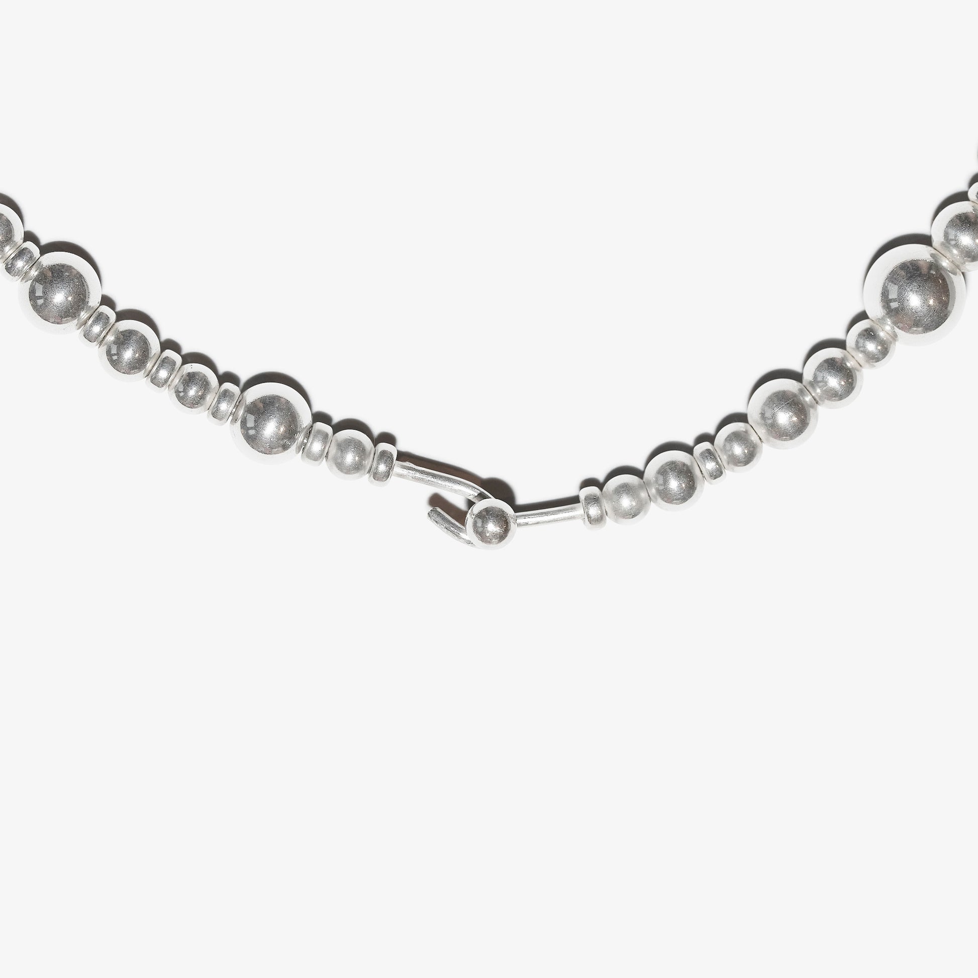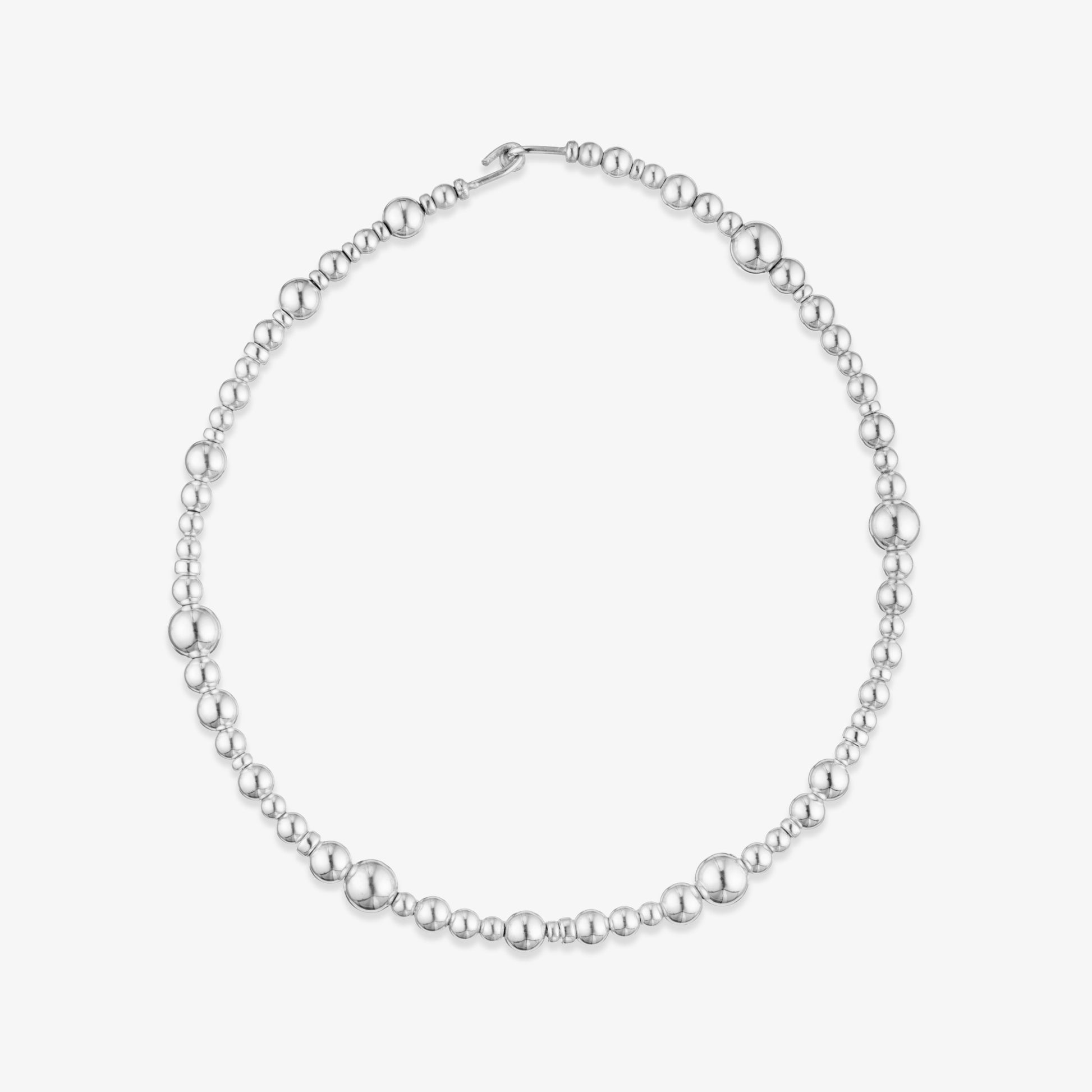 A heavyweight statement collar necklace made up of multiple sterling silver beads of different shapes and sizes.