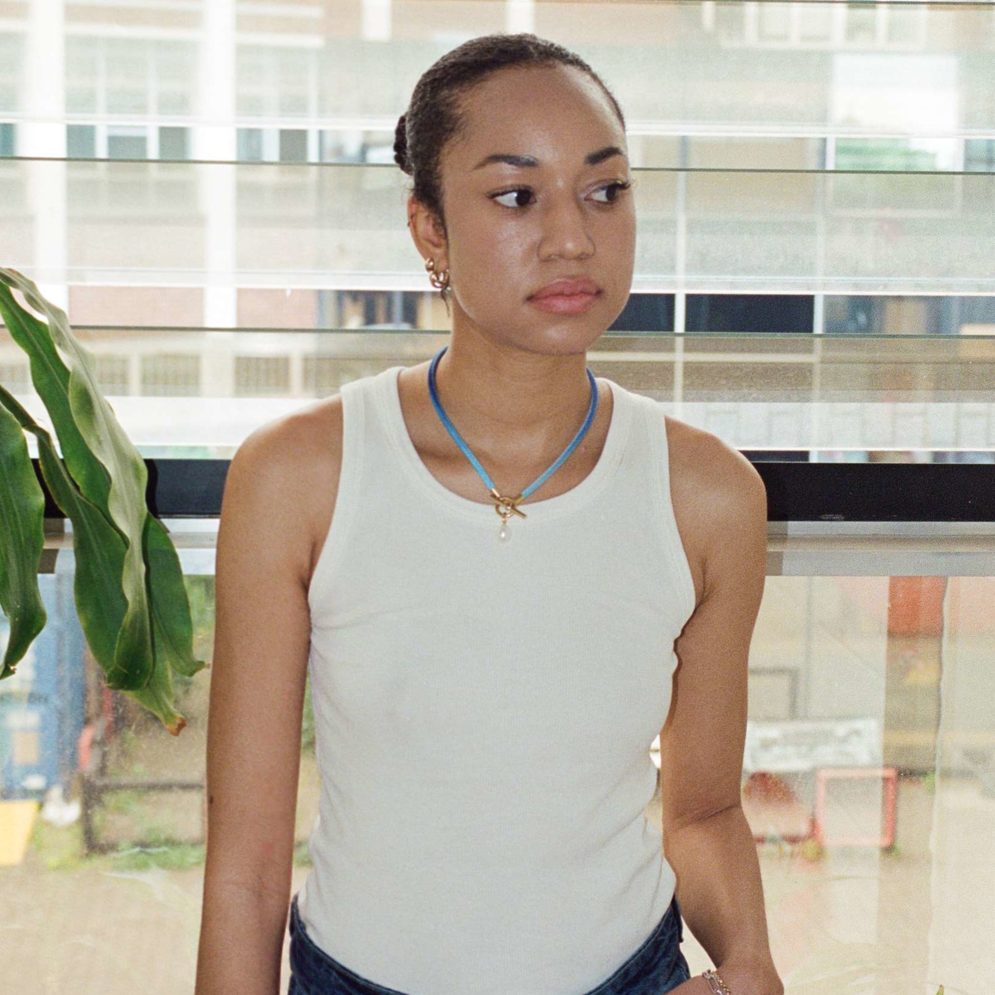 Aylea wears the Splash Pearl Collar Necklace in 18kt gold vermeil with layered gold hoops such as the Everlasting Hoop Earrings in 9kt gold.
