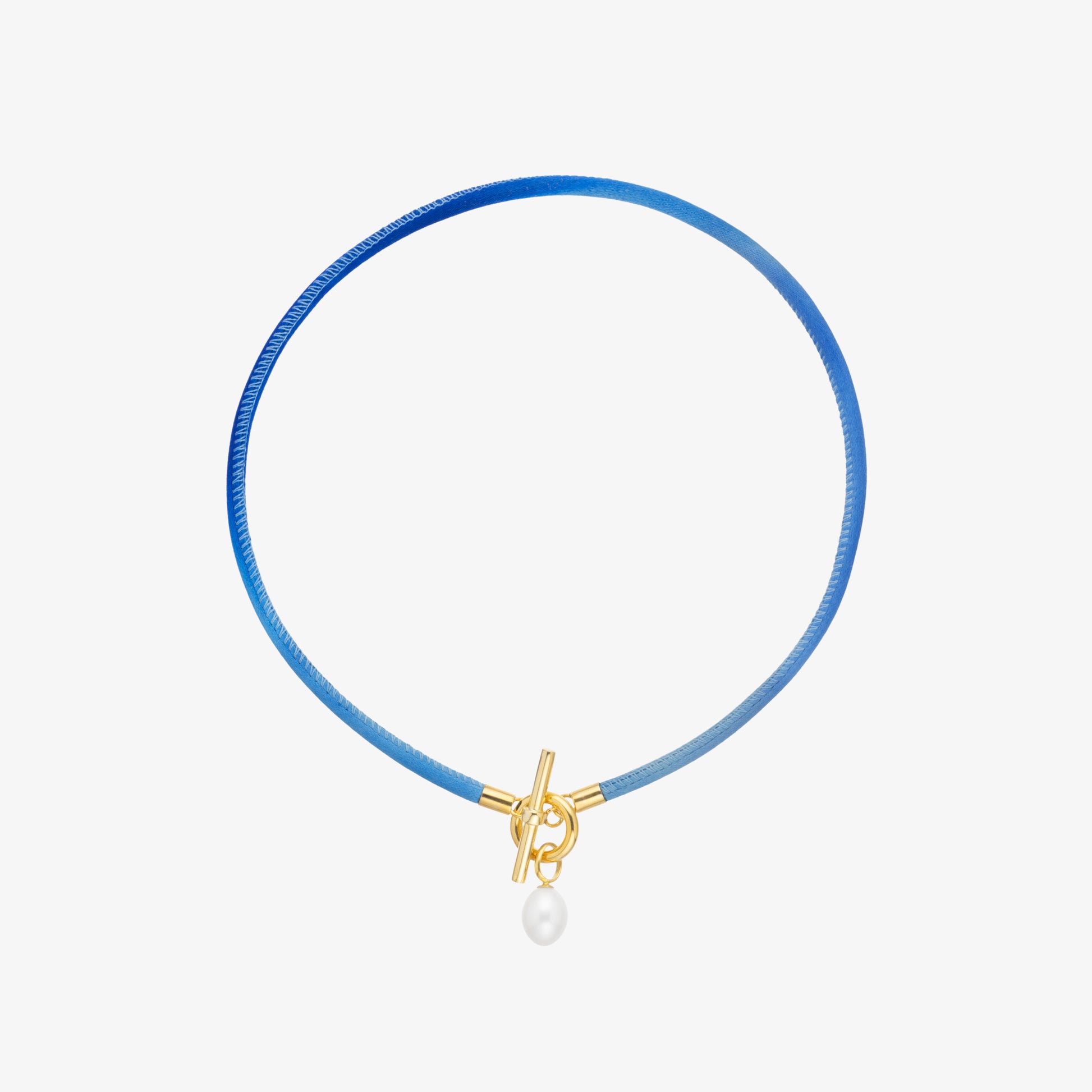 The Splash Pearl Collar Necklace is a blue tie-dyed silk design, created in collaboration with print designer Fran Buss. Featuring a chunky 18kt gold vermeil toggle clasp with a freshwater cultured pearl pendant to add subtle detail.